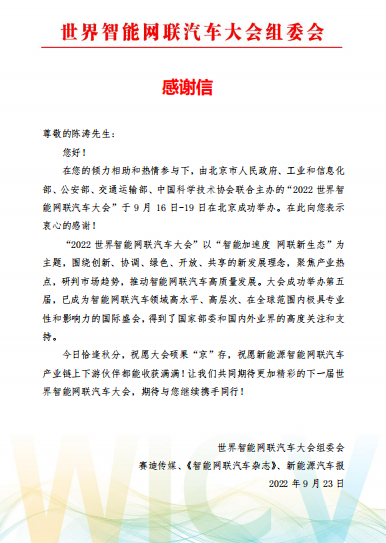 近日,世界智能网联汽车大会组委会向中国汽研发来感谢信,对中国汽研为“2022世界智能网联汽车大会”的成功召开所提供的支持表示感谢。