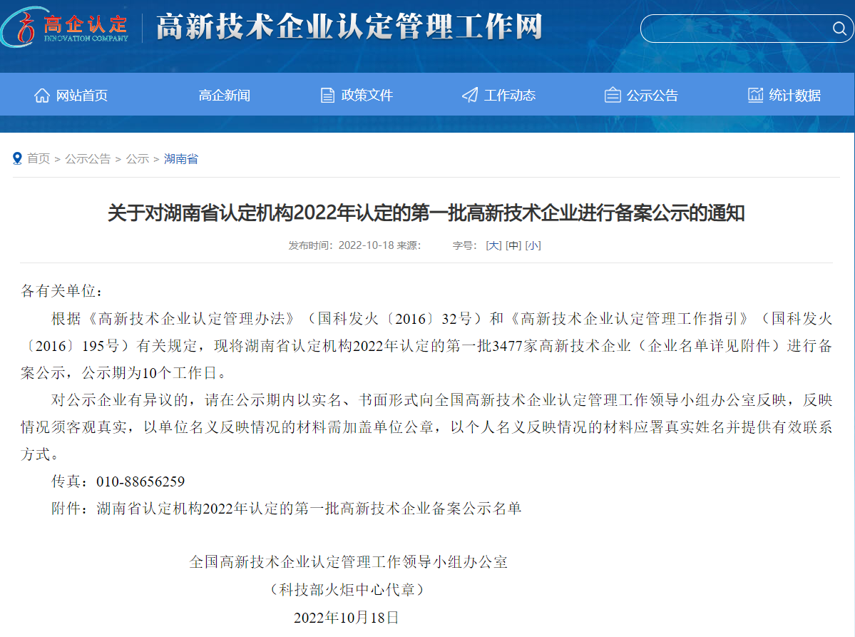10月18日,全国高新技术企业认定管理工作领导小组办公室正式发布了《关于对湖南省认定机构2022年认定的第一批高新技术企业进行备案公示的通知》,中汽院智能网联(湖南)公司成功通过国家高新技术企业认定。