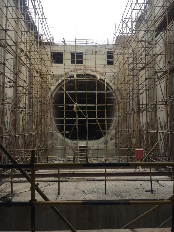 一是风机直径达9米,风在闭环风洞里循环。由于风机出口是圆形,而风洞闭环整体截面是矩形,这就要求从风机出口端到转角叶片的进口端是从圆形到矩形的一段渐变截面混凝土洞体。