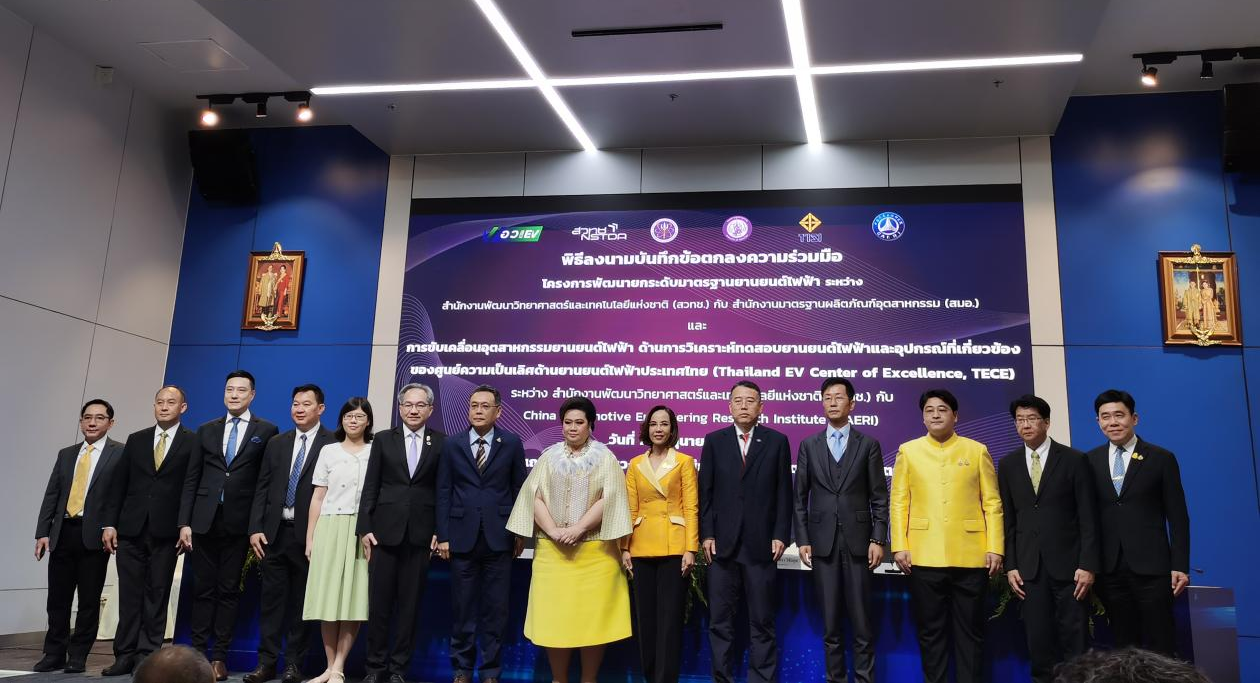 6月26日,泰国高等教育科研与创新部与泰国工业部举办了泰国国家电动汽车检测中心启动仪式,泰国高等教育科研与创新部部长Supamas Isarabhakdi,泰国工业部部长Pimphattra Wichaikul,泰国国家科学技术发展局局长Sukit Limpijumnong,中国驻泰大使秘书王思思,中国汽研党委书记、董事长周玉林,中国中检泰国公司总经理柳华绿以及在泰整车厂代表、行业机构代表等嘉宾出席会议。会上,在泰国高等教育科研与创新部部长Supamas Isarabhakdi和泰国工业部部长Pimphattra Wichaikul共同见证下,中国汽研党委书记、董事长周玉林与泰国国家科学技术发展局局长Sukit Limpijumnong代表双方签署战略合作协议,助力泰国国家电动汽车检测中心建立,共同推进泰国电动汽车技术发展。