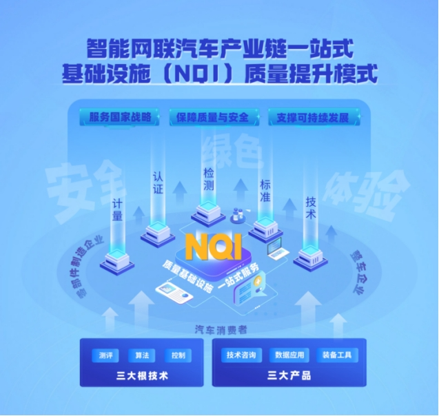 在汽车产业电动化、智能化与网联化方向的发展趋势下,中国汽研基于《智能汽车创新发展战略》等文件中提出的高质量发展要求,聚焦服务国家战略、引领产业技术升级、助力智能网联汽车产业可持续发展,持续配合产业链发展深度布局,以一站式基础设施(NQI)为基础,从标准制定、检测能力、计量技术、认证体系和关键技术等方面综合施策,构建了中国汽研特色的“智能网联汽车产业链一站式基础设施(NQI)质量提升模式”,以推动智能网联汽车产业共性问题的改善与创新,持续赋能产业的高质量发展。
