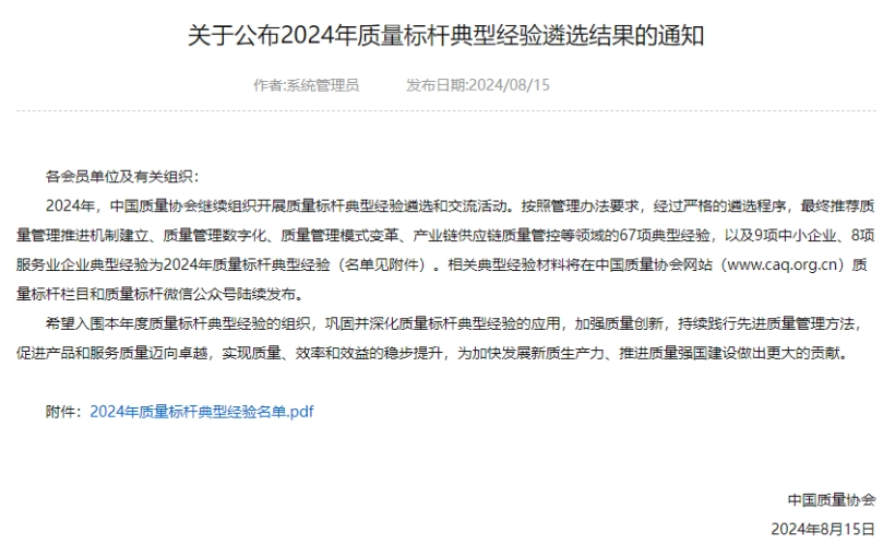 喜报!中国汽研荣获2024年中国质量协会质量标杆典型经验,推动智能网联汽车产业高质量发展
