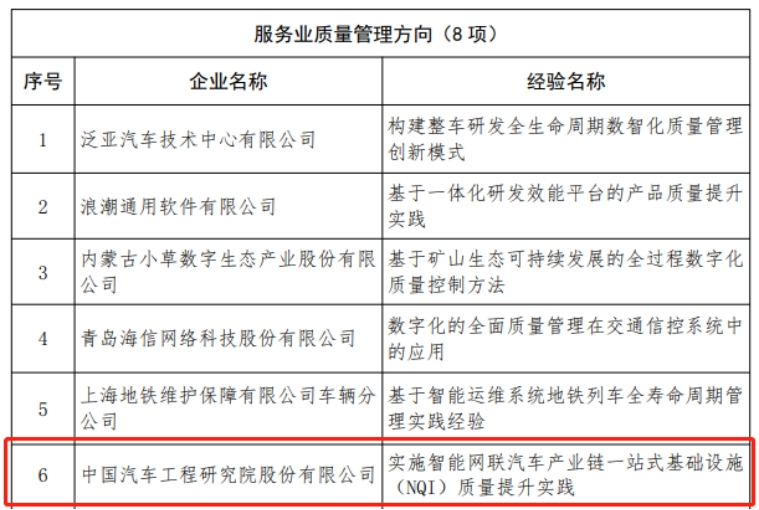 近日,中国质量协会发布《关于公布2024年质量标杆典型经验遴选结果的通知》,中国汽研组织申报的“实施智能网联汽车产业链一站式基础设施(NQI)质量提升实践”成功入选服务业质量管理方向质量标杆典型经验。