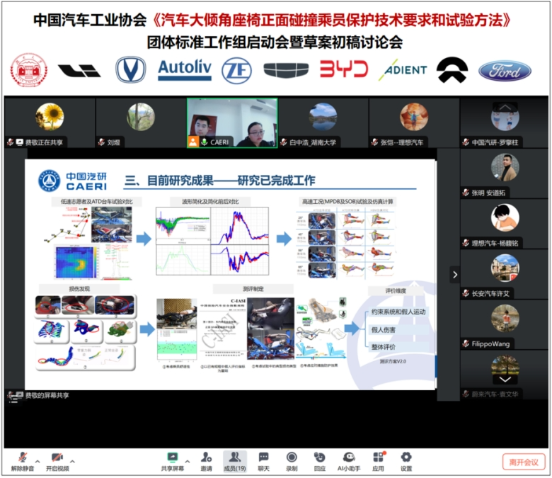 会上,中国汽研对各工作组参与单位的支持表示感谢,随后介绍了《汽车大倾角座椅正面碰撞乘员保护技术要求和试验方法》团体标准的制定背景、研究成果等内容。参会专家对标准草案进行了充分探讨,此项团体标准将对汽车安全带来更有力的技术支撑和更科学的开发指导。