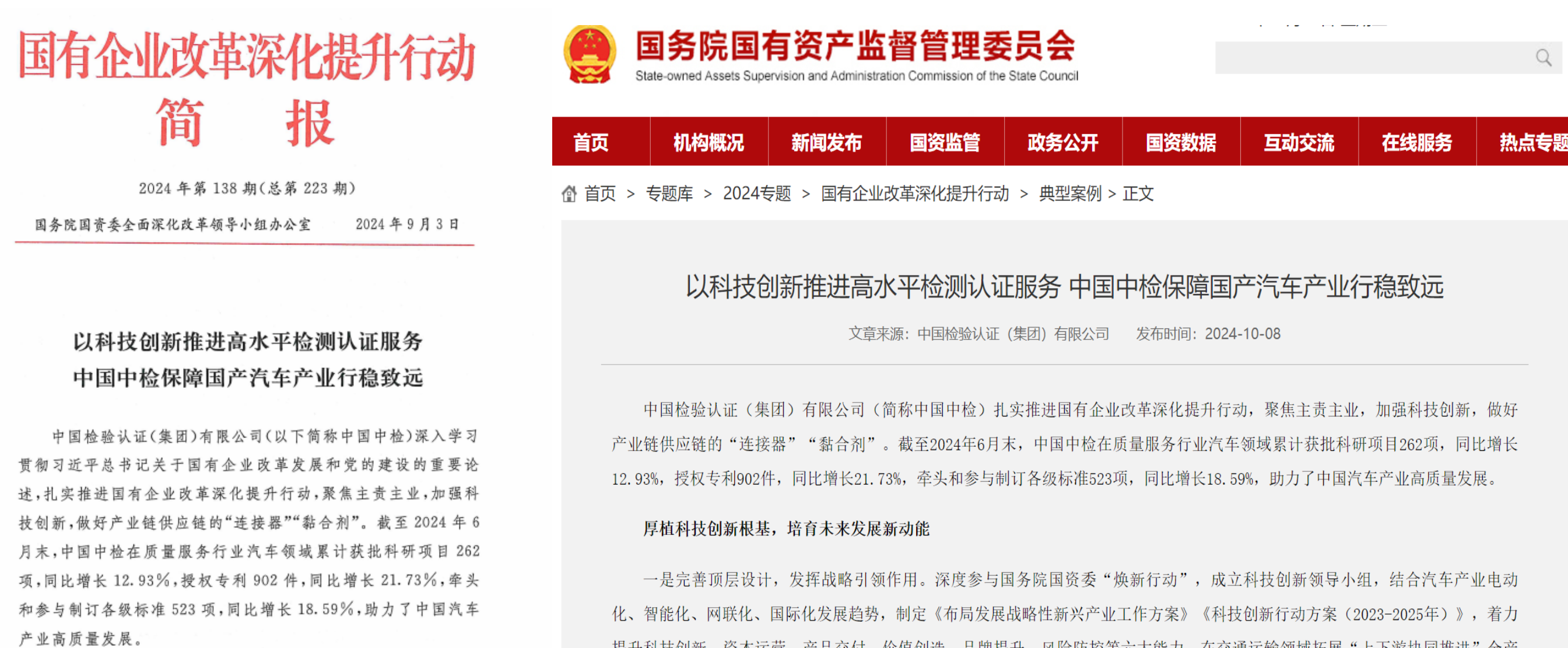 中国汽研参与撰写的《以科技创新推进高水平检测认证服务 中国中检保障国产汽车产业行稳致远》稿件在《国有企业改革深化提升行动简报》(2023年第138期)上刊发,并在国务院国资委官网发布。