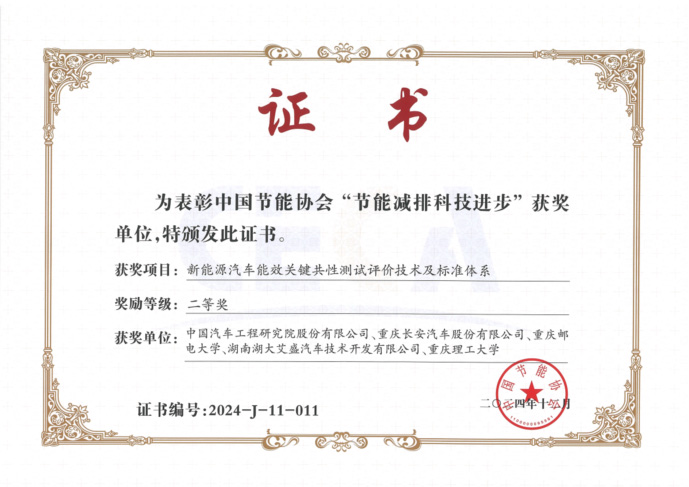 近日,中国节能协会发布“关于颁布2024年节能协会创新奖励获奖结果的通知”,中国汽研牵头项目“新能源汽车能效关键共性测试评价技术及标准体系”荣获中国节能协会“节能减排科技进步”二等奖。