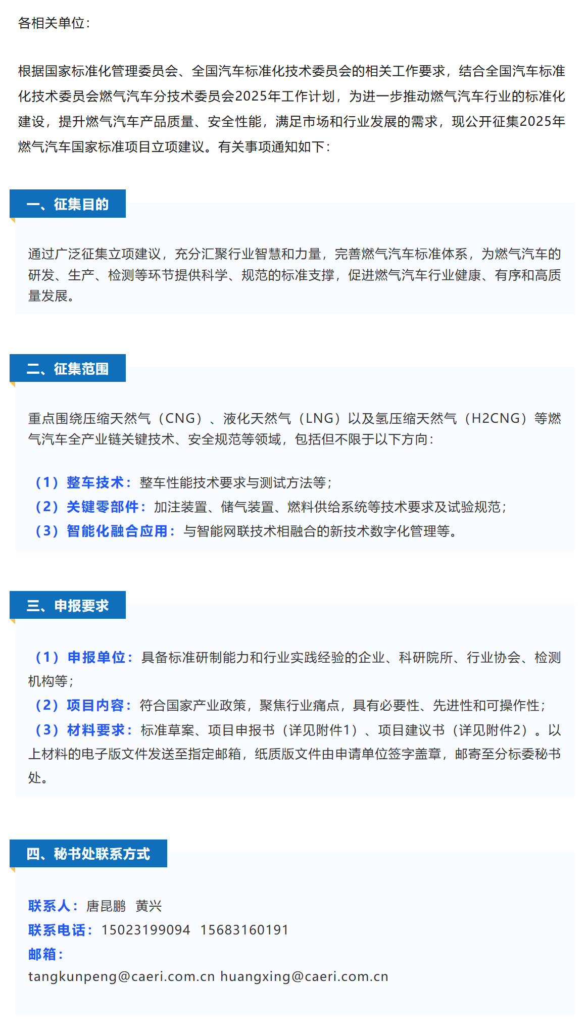 关于征集燃气汽车2025年国家标准项目立项的通知