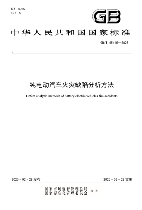 近日,由国家市场监督管理总局缺陷产品召回技术中心牵头、中国汽研主要参与的GB/T 45415-2025《纯电动汽车火灾缺陷分析方法》国家标准正式发布实施。
