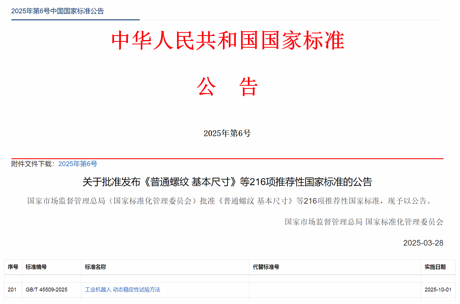 近日,国家市场监督管理总局(国家标准化管理委员会)正式批准发布《工业机器人 动态稳定性试验方法》(GB/T 45509-2025)推荐性国家标准。该标准由中国汽研凯瑞机器人公司主导,是国际首个测试工业机器人动态稳定性的方法标准。