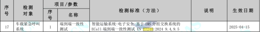 近日,中国汽车工程研究院股份有限公司(以下简称“中国汽研”)信息智能事业部正式获得中国合格评定国家认可委员会(CNAS)颁发的EN 17240:2024标准检测能力授权,成为国内首家同时具备ETSI TS 103 412、EN 16454:2023、CEN TS 17240-2018及EN 17240:2024四项eCall核心标准CNAS检测资质的权威汽车国检机构。