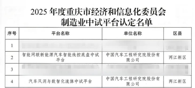 喜报丨中国汽研2个平台荣获重庆市经信委制造业中试平台