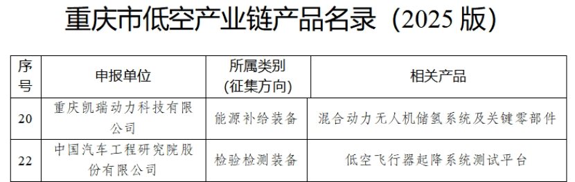 喜报丨中国汽研2个产品入选《重庆市低空产业链产品名录(2025年版)》